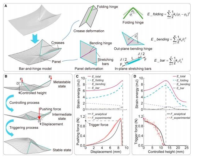 通过将特殊材料的片材折叠成特定的折痕图案,系统具有了稳定状态、亚稳定状态和无数的中间状态。当双稳态结构从其亚稳态转变为稳态时,存在一个临界点,此时存储的应变能达到最大值,同时结构会发生失稳,快速跃变至稳态。